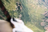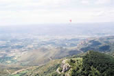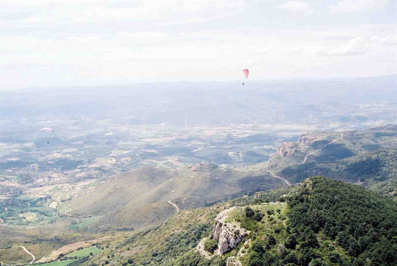 Vista desde el despegue: parapentes volando sobre el castillo |