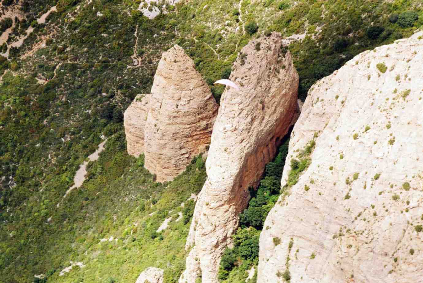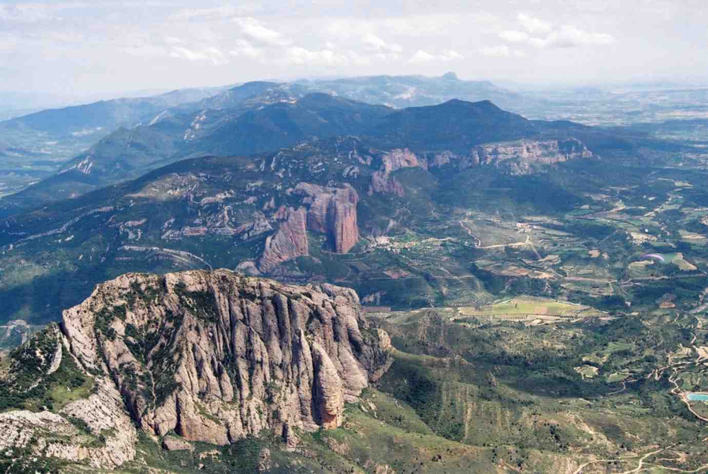 Volando sobre el Mirador de los Buitres. Al fondo de la foto, los Mallos de Riglos, y Agüero más atrás |